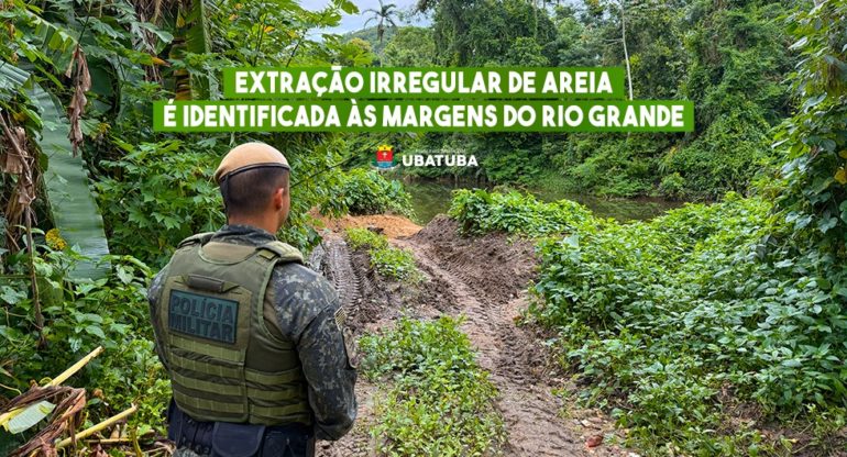 Uma ação integrada envolvendo a Polícia Militar Ambiental e a Secretaria Municipal de Meio Ambiente resultou na identificação e repressão de atividade irregular de extração de areia no bairro Jardim Carolina, em Ubatuba. A ocorrência foi registrada na Rua Maria Paula dos Santos, ao final da via conhecida como antiga Rua da Coca-Cola, em área próxima às margens do Rio Grande.