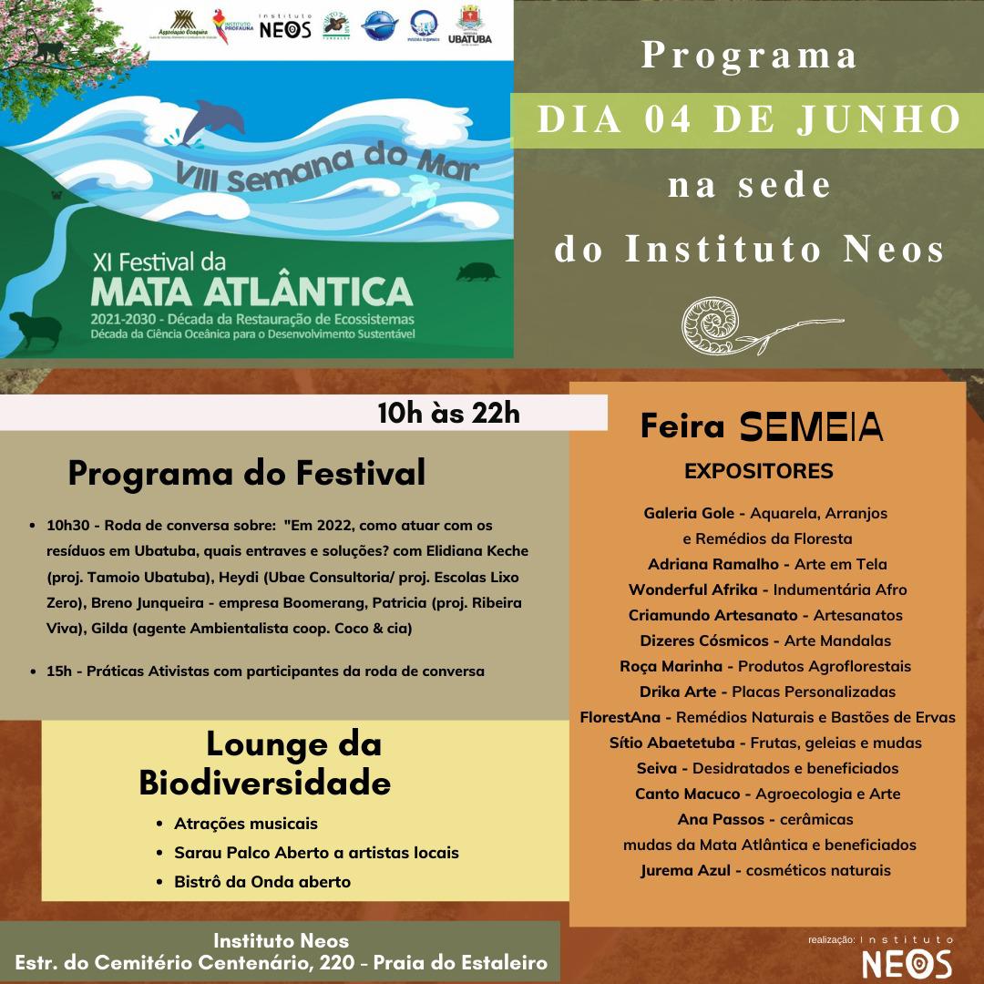 Com uma programação repleta de atividades como palestras, plantios, educação ambiental e rodas de conversa. No próximo sábado, 4, será realizada uma importante roda de conversa, com o tema: “Em 2022, como atuar com os resíduos em Ubatuba, quais entraves e soluções?”, e ao final do dia a atração de encerramento será o lounge da biodiversidade com atrações musicais e sarau Palco Aberto.