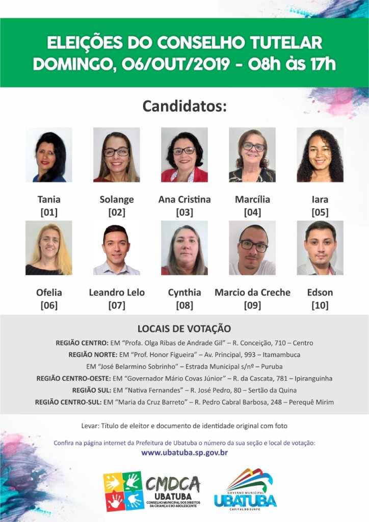 No próximo domingo, 6 de outubro, acontecem em todo o país as eleições de membros do Conselho Tutelar para o mandato 2020-2024. Em Ubatuba, há um total de dez candidatos que disputam uma das cinco vagas existentes.